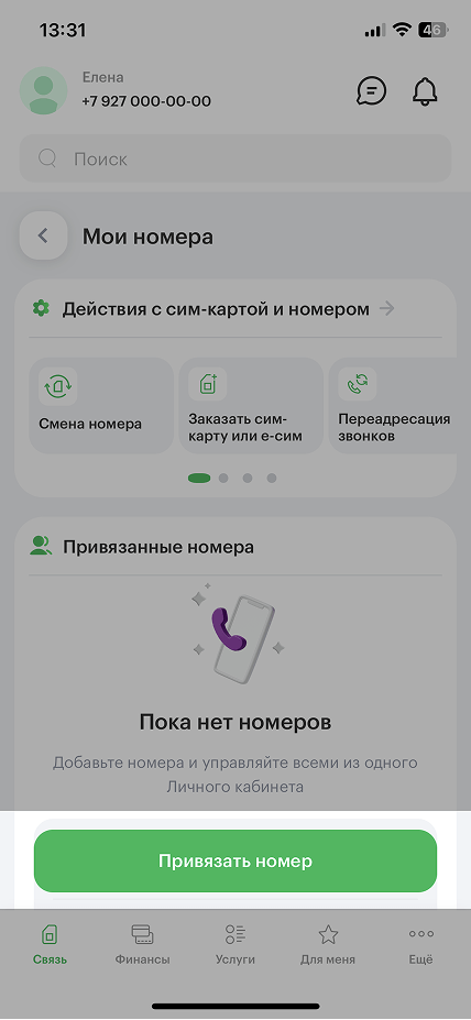 - 2В разделе «Мои номера» нажмите на кнопку «Привязать номер». Если номер оформлен не на вас, дождитесь подтверждения.